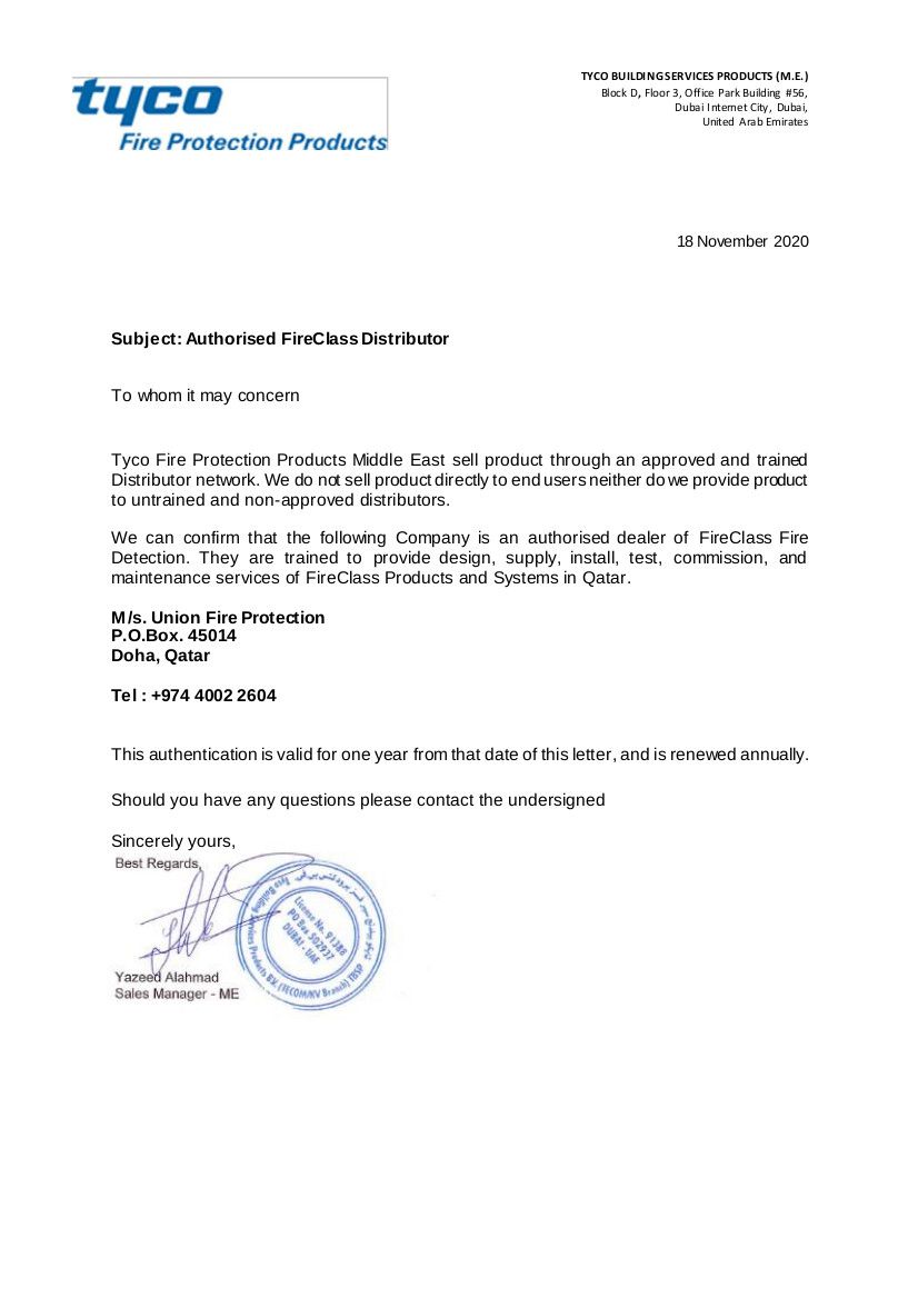Tyco Authorized  Union Fire Protection as a Trained dealer for Qatar to provide design, supply, install, test, commission, and maintenance services of Fireclass Products and Systems.